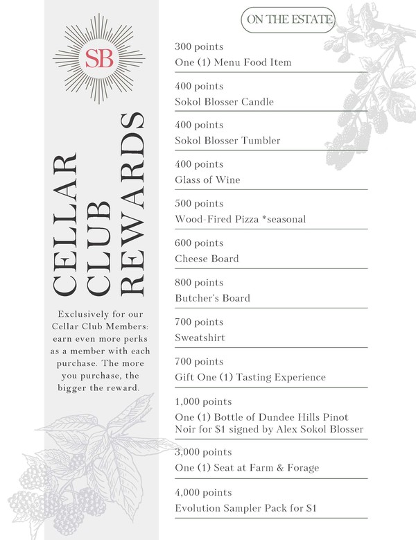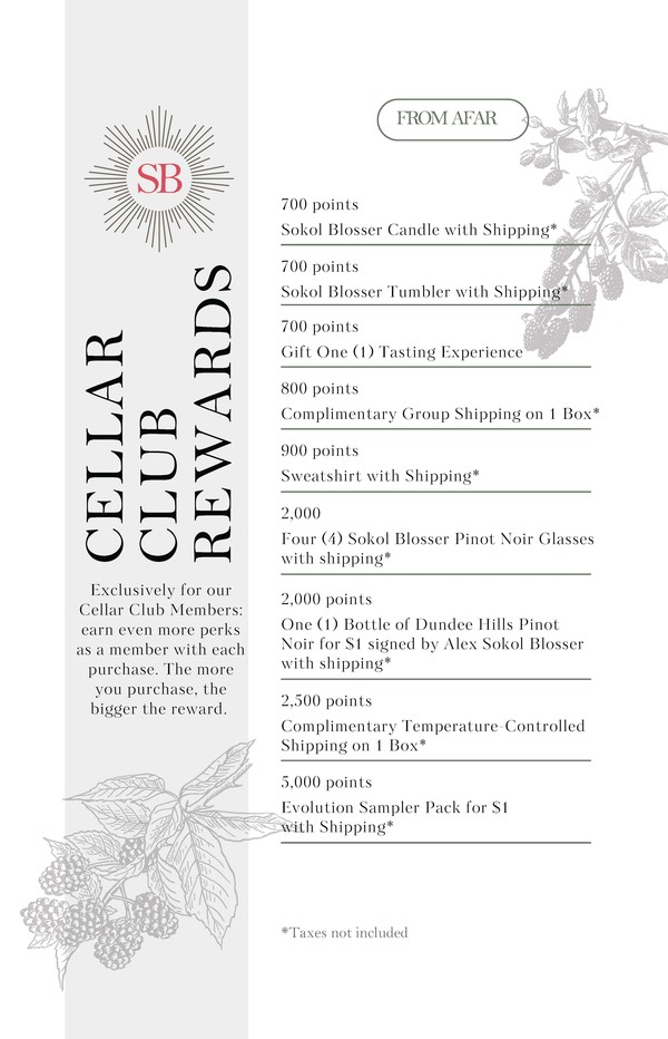 With Cellar Club members across the country, we’ve created rewards that can be enjoyed either at our Winery or right from your home. Below you will find rewards options for both ‘on the estate’ and ‘from afar.’ Choose one or the other when redeeming points. Email CellarClub@sokolblosser.com or call 503-864-2282 to redeem and Log in to keep track of your points.